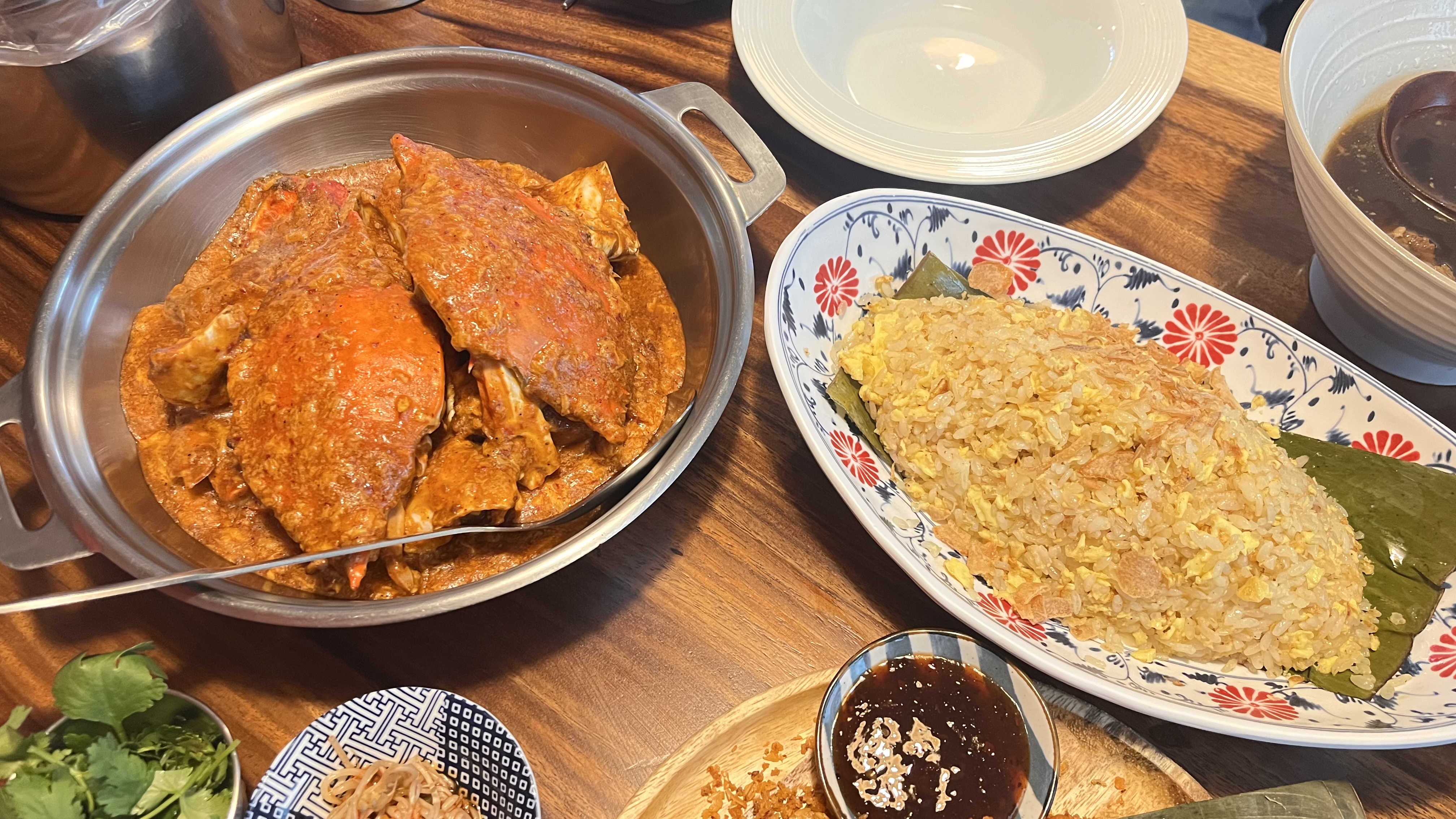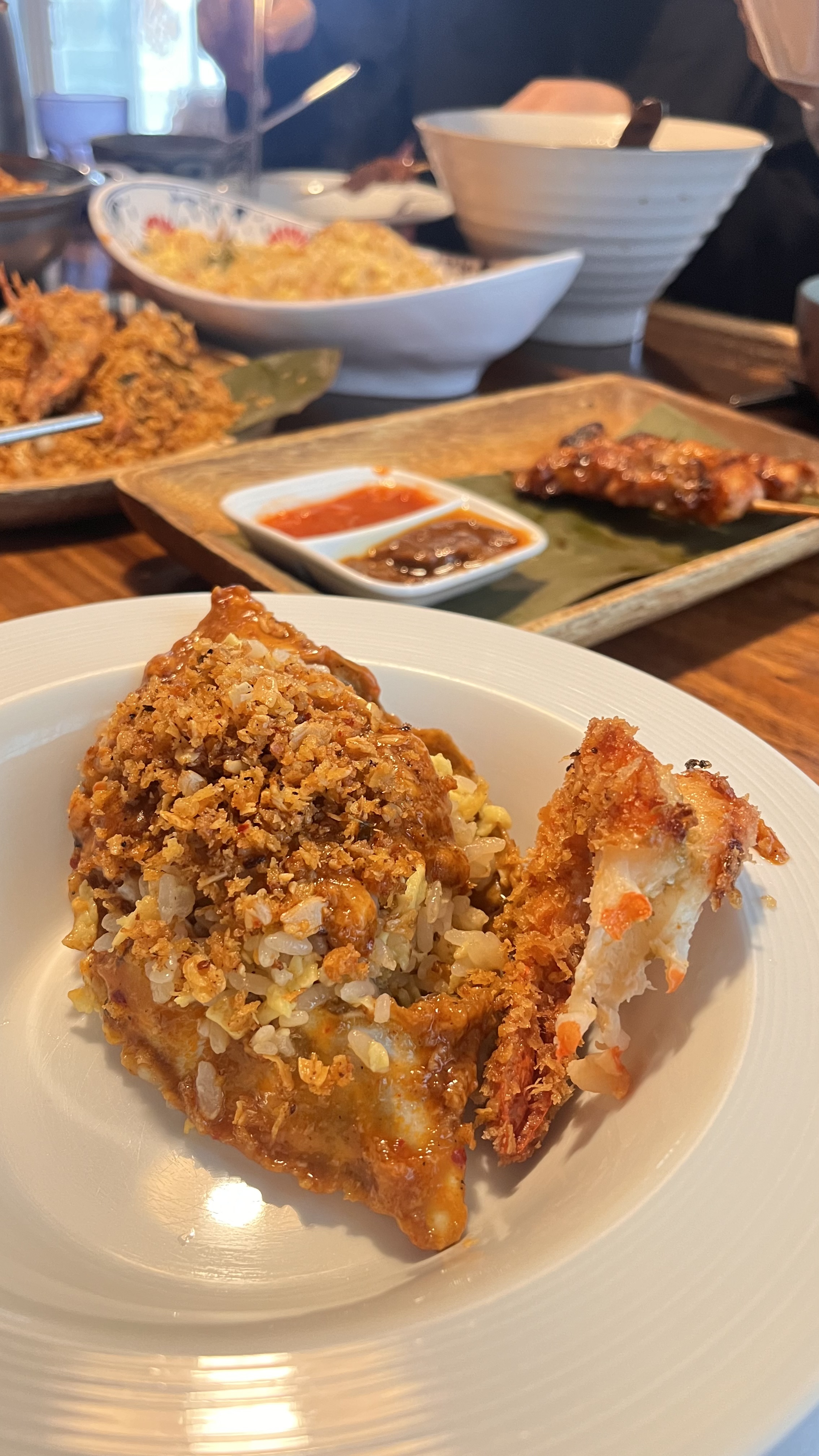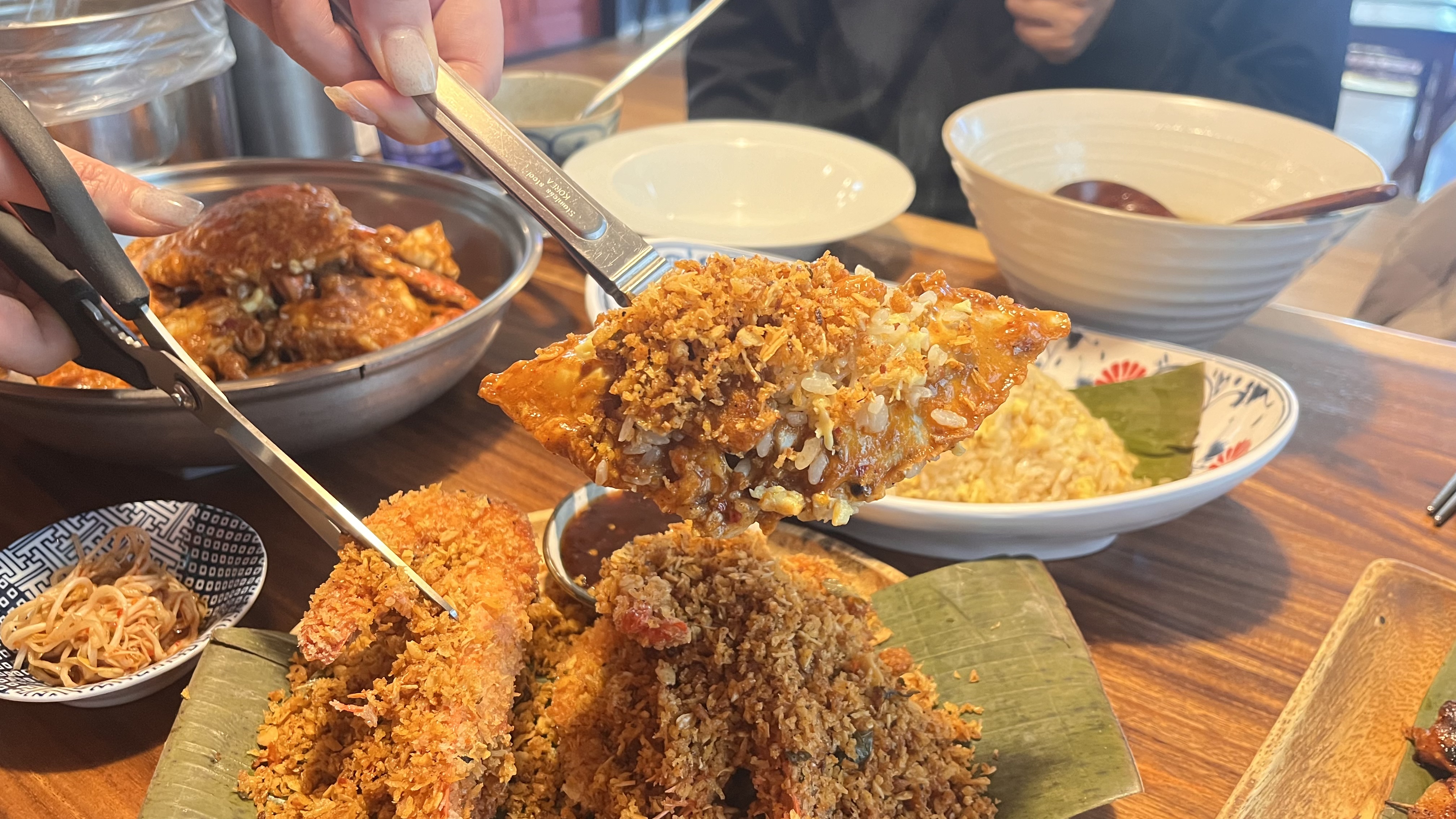 푸팟퐁커리의 게 위에 갈릭라이스를 넣은 후