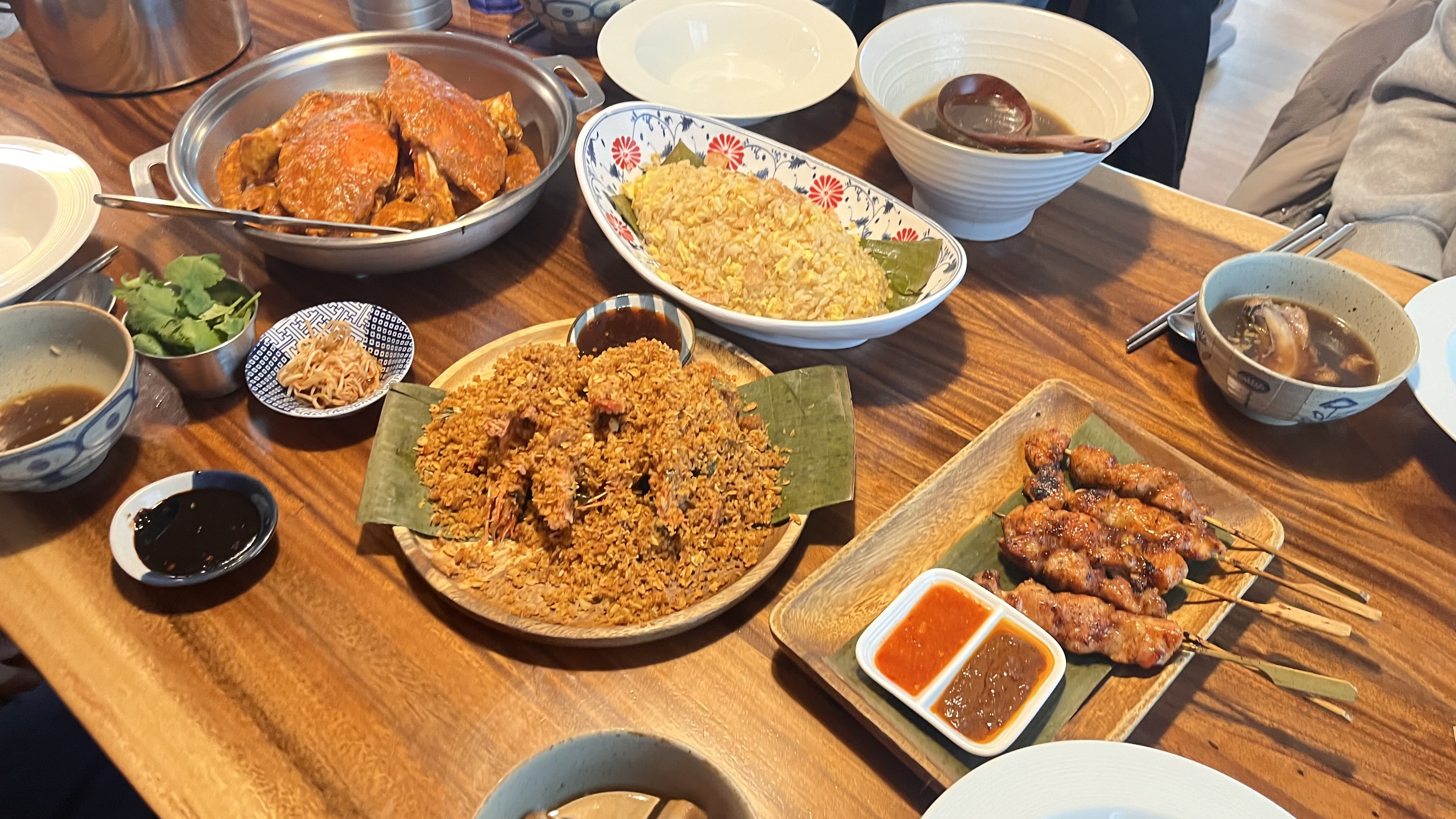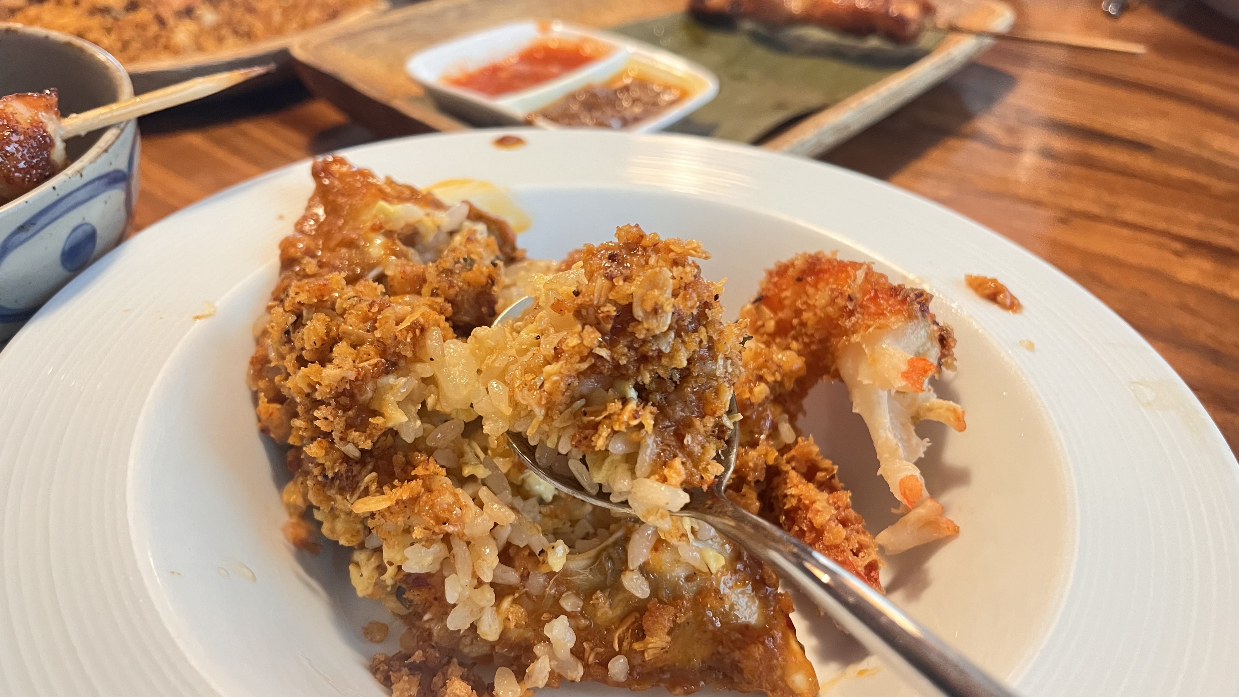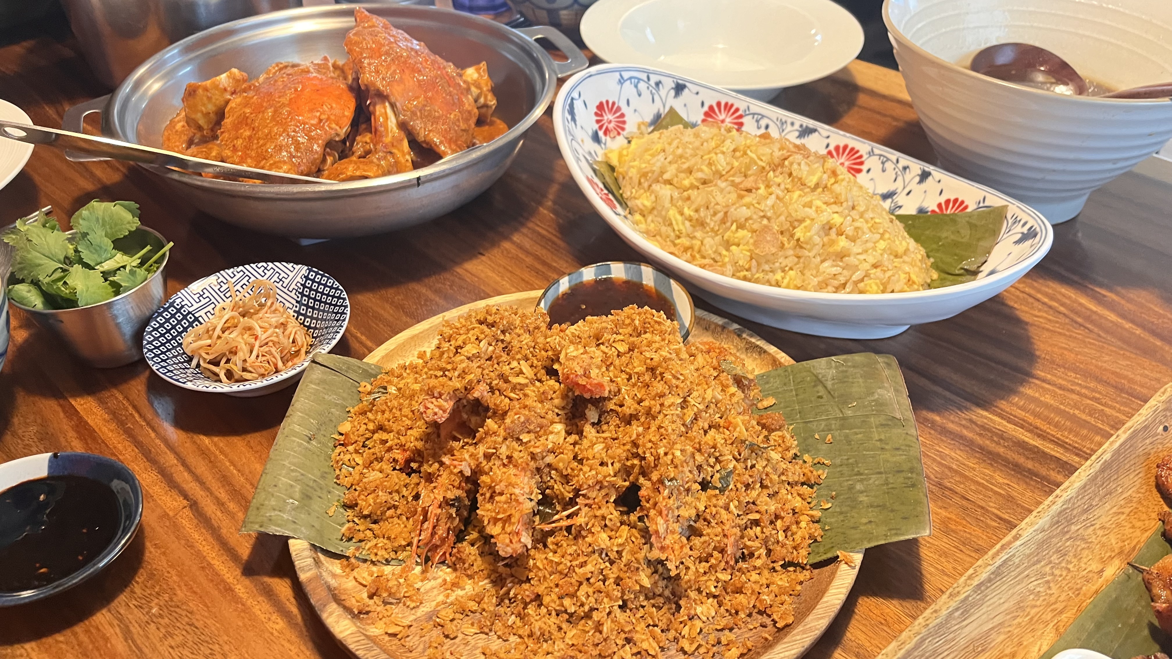 푸팟퐁커리의 게 위에 갈릭라이스를 넣은 후